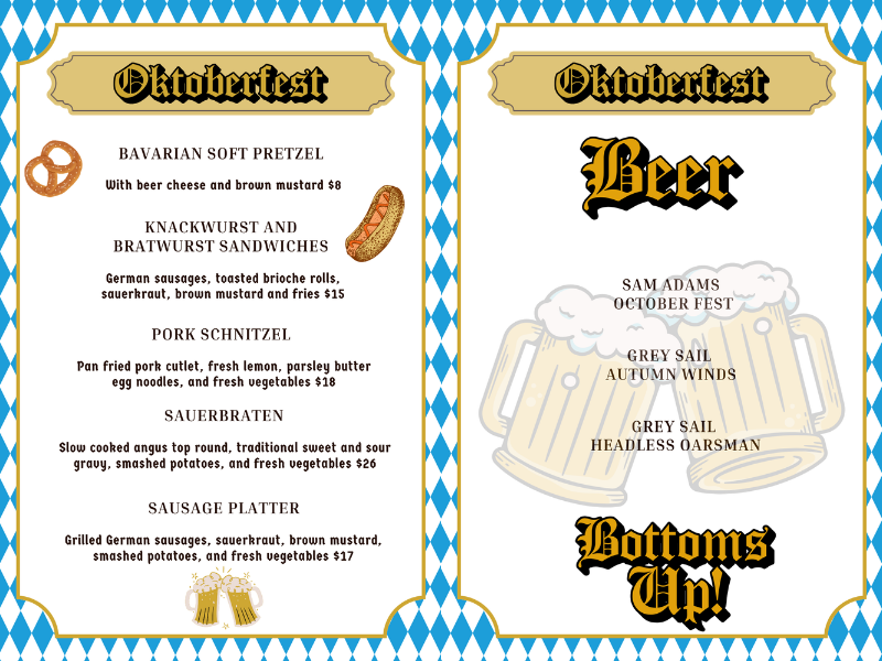 Savor hearty favorites like pretzels, bratwurst, schnitzel, and more — perfectly paired with seasonal beers and crisp autumn air. Gather your friends, bring your appetite, and enjoy the lively spirit of Oktoberfest right here at the Inn!